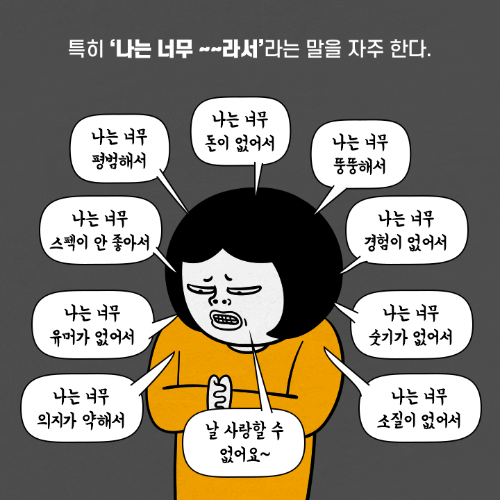 자존감이란 자신을 대하는 태도다. 자존감이 높으면 스스로를 가치 있는 사람으로 여기기 때문에 자신의 판단을 신뢰하고 그런 자신을 좋아한다. 반면 자존감이 낮은 사람은 자신에 대해 호의적이지 못한 감정을 가지기 때문에 평소 스스로를 과소평가하는 부정적인 말을 자주 한다. 특히 ‘나는 너무 ~~이라서’라는 말을 자주 한다. 이 말 뒤에는 나는 항상 그래왔고 앞으로도 그런 상태에 머물 것이라는 의미가 숨어 있다. 이런 말을 반복하면서 무의식적으로 자신의 삶을 비참한 방향으로 끌고 들어가 스스로에게 벌을 주는 경향이 있다. 자신을 소중히 여길 줄 모르기 때문에 타인을 존중하는 방법도 잘 모른다. 하지만 ‘나는 너무 ~~이라서’ 같은 말은 스스로에게 하는 최악의 거짓말이다. 자칫 ‘겸손’한 태도로 착각하기 쉽지만..